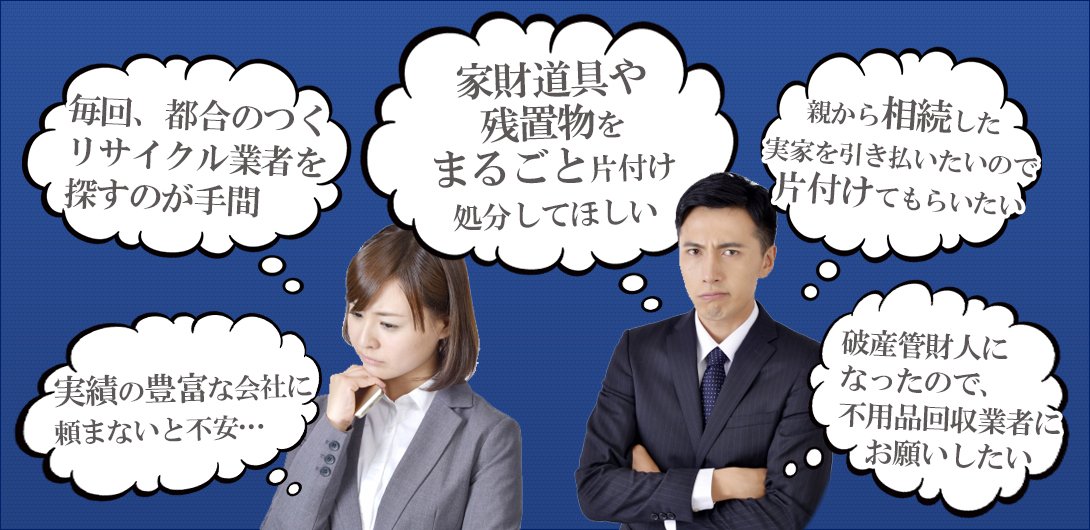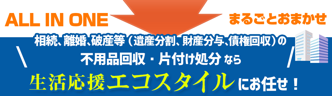 - 相続、離婚、破産等(遺産分割、財産分与、債権回収)にともなう不用品回収を行う際、いつも決まった会社があると手間やコストが楽になります!